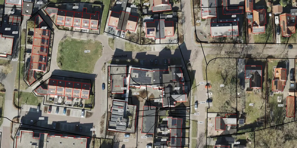 Het perceel waarop Zonnehof 15 staat heeft een oppervlakte van 1425 m². Dit is een zeer groot perceel. De perceeloppervlakte wordt geregistreerd door het Kadaster. Gedetailleerde informatie over de maten van dit perceel kunt u vinden in het rapport Kadastrale kaart met maatvoering van Zonnehof 15.