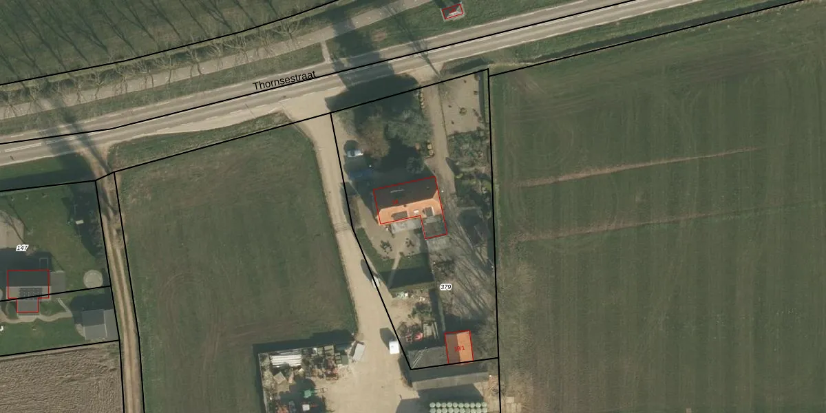 Thornsestraat 18 is gelegen op kadastraal perceel OOI00G379. Deze kadastrale aanduiding is uniek en wordt gebruikt door het Kadaster om eigendomsrechten en andere zakelijke rechten vast te leggen. Het perceel maakt onderdeel uit van de kadastrale gemeente Ooij.