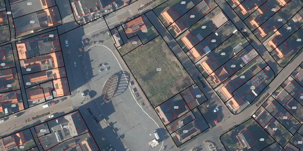 Het perceel waarop Plein 1945 5-Q staat heeft een oppervlakte van 1236 m². Dit is een zeer groot perceel. De perceeloppervlakte wordt geregistreerd door het Kadaster. Gedetailleerde informatie over de maten van dit perceel kunt u vinden in het rapport Kadastrale kaart met maatvoering van Plein 1945 5-Q.