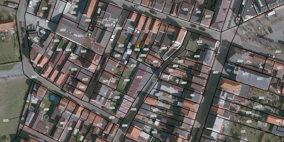 Poststraat 1-G1 is gelegen op kadastraal perceel PLP00C1882. Deze kadastrale aanduiding is uniek en wordt gebruikt door het Kadaster om eigendomsrechten en andere zakelijke rechten vast te leggen. Het perceel maakt onderdeel uit van de kadastrale gemeente Philippine.