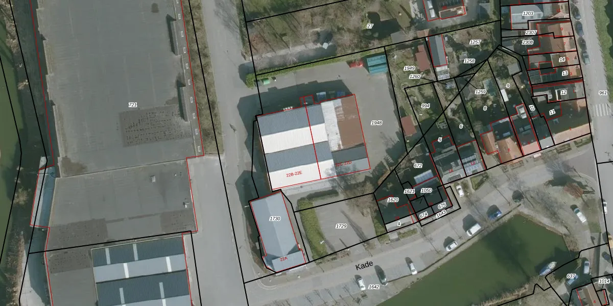 Het perceel waarop Kade 22-E staat heeft een oppervlakte van 1981 m². Dit is een zeer groot perceel. De perceeloppervlakte wordt geregistreerd door het Kadaster. Gedetailleerde informatie over de maten van dit perceel kunt u vinden in het rapport Kadastrale kaart met maatvoering van Kade 22-E.