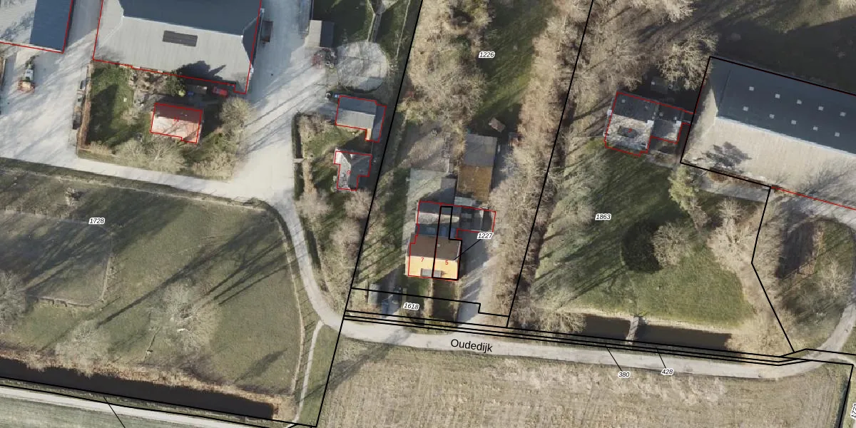 Oudedijk 7 is gelegen op kadastraal perceel ERM00D1226. Deze kadastrale aanduiding is uniek en wordt gebruikt door het Kadaster om eigendomsrechten en andere zakelijke rechten vast te leggen. Het perceel maakt onderdeel uit van de kadastrale gemeente Eenrum.