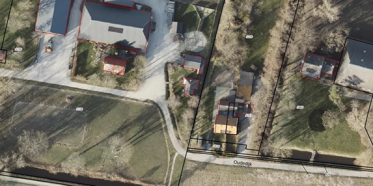 Het perceel waarop Oudedijk 9 staat heeft een oppervlakte van 1,4 ha. Dit is een zeer groot perceel. De perceeloppervlakte wordt geregistreerd door het Kadaster. Gedetailleerde informatie over de maten van dit perceel kunt u vinden in het rapport Kadastrale kaart met maatvoering van Oudedijk 9.