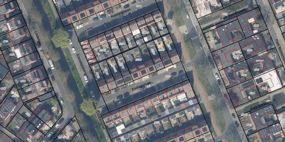 Esdoornlaan 10 is gelegen op kadastraal perceel PAK00C11316. Deze kadastrale aanduiding is uniek en wordt gebruikt door het Kadaster om eigendomsrechten en andere zakelijke rechten vast te leggen. Het perceel maakt onderdeel uit van de kadastrale gemeente Pijnacker.