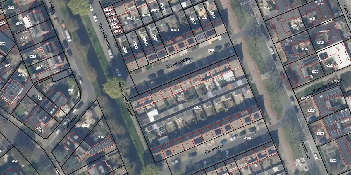 Esdoornlaan 13 is gelegen op kadastraal perceel PAK00C5071. Deze kadastrale aanduiding is uniek en wordt gebruikt door het Kadaster om eigendomsrechten en andere zakelijke rechten vast te leggen. Het perceel maakt onderdeel uit van de kadastrale gemeente Pijnacker.