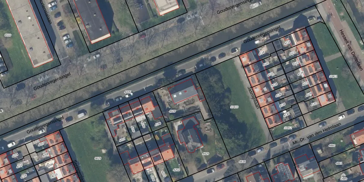 Goudenregensingel 30 is gelegen op kadastraal perceel PAK00C4928. Deze kadastrale aanduiding is uniek en wordt gebruikt door het Kadaster om eigendomsrechten en andere zakelijke rechten vast te leggen. Het perceel maakt onderdeel uit van de kadastrale gemeente Pijnacker.