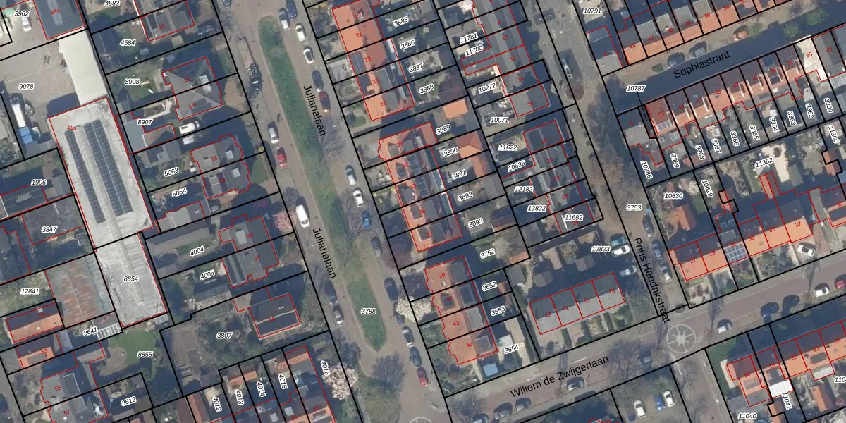 Gebruik de zoekbalk of klik op een perceel voor informatie over de adressen binnen dit perceel.