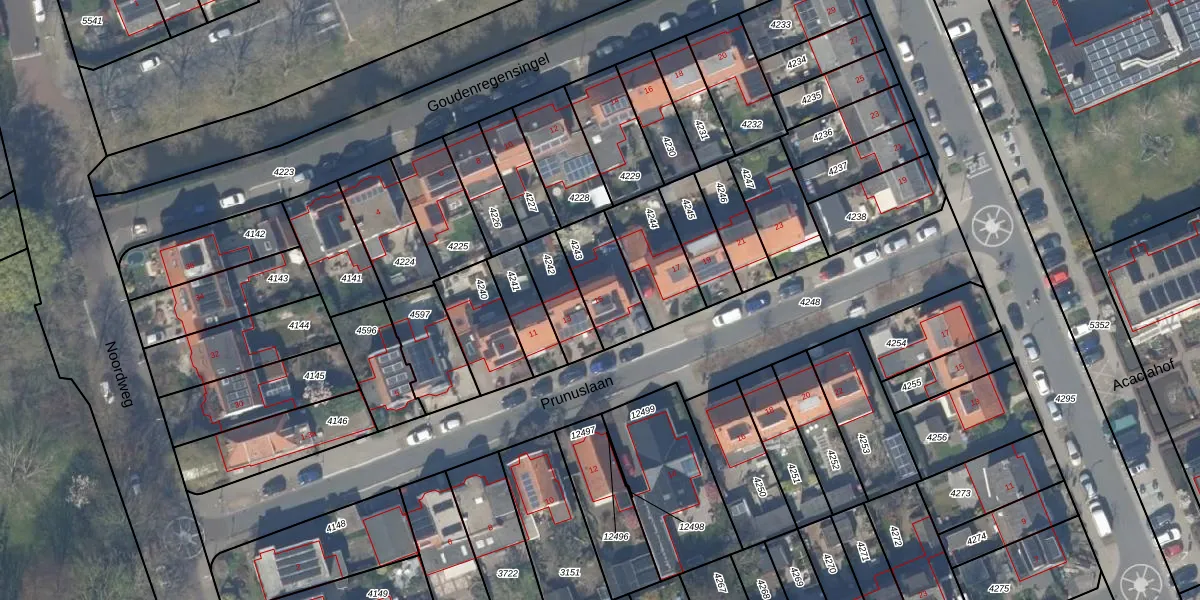 Prunuslaan 15 is gelegen op kadastraal perceel PAK00C4243. Deze kadastrale aanduiding is uniek en wordt gebruikt door het Kadaster om eigendomsrechten en andere zakelijke rechten vast te leggen. Het perceel maakt onderdeel uit van de kadastrale gemeente Pijnacker.