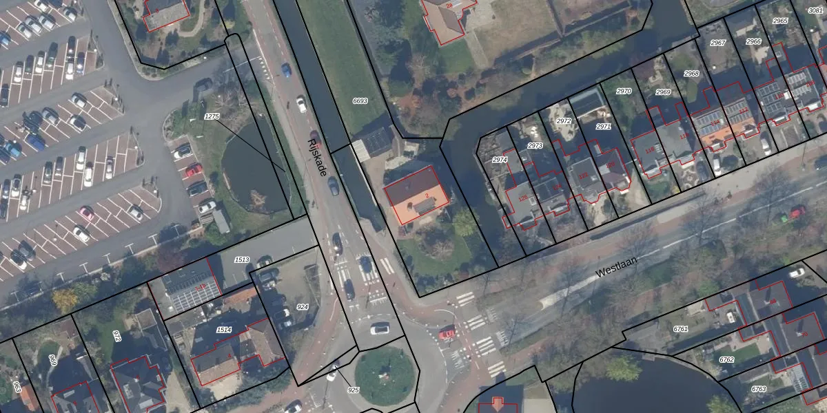 Het perceel waarop Rijskade 2 staat heeft een oppervlakte van 1495 m². Dit is een zeer groot perceel. De perceeloppervlakte wordt geregistreerd door het Kadaster. Gedetailleerde informatie over de maten van dit perceel kunt u vinden in het rapport Kadastrale kaart met maatvoering van Rijskade 2.