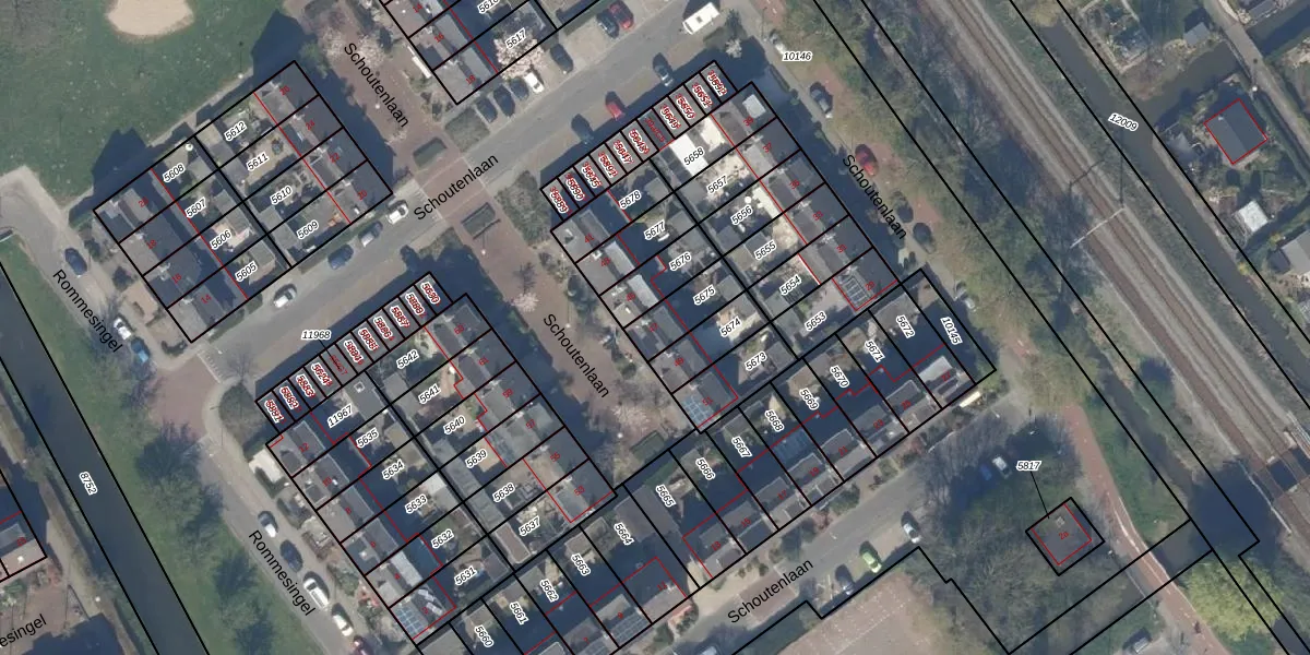 Schoutenlaan 47 is gelegen op kadastraal perceel PAK00C5675. Deze kadastrale aanduiding is uniek en wordt gebruikt door het Kadaster om eigendomsrechten en andere zakelijke rechten vast te leggen. Het perceel maakt onderdeel uit van de kadastrale gemeente Pijnacker.