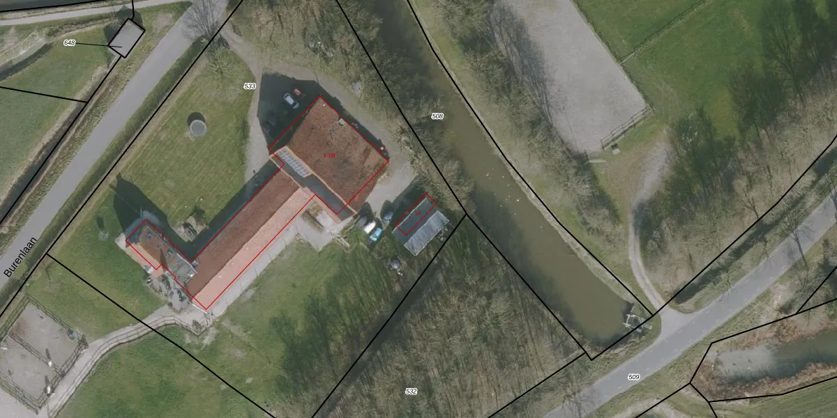Het perceel waarop Burenlaan 1-A staat heeft een oppervlakte van 6000 m². Dit is een zeer groot perceel. De perceeloppervlakte wordt geregistreerd door het Kadaster. Gedetailleerde informatie over de maten van dit perceel kunt u vinden in het rapport Kadastrale kaart met maatvoering van Burenlaan 1-A.