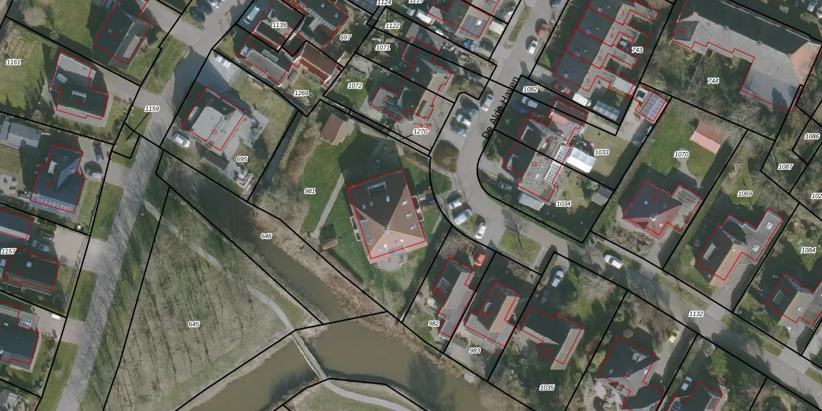 Het perceel waarop De Alde Haven 12 staat heeft een oppervlakte van 1470 m². Dit is een zeer groot perceel. De perceeloppervlakte wordt geregistreerd door het Kadaster. Gedetailleerde informatie over de maten van dit perceel kunt u vinden in het rapport Kadastrale kaart met maatvoering van De Alde Haven 12.