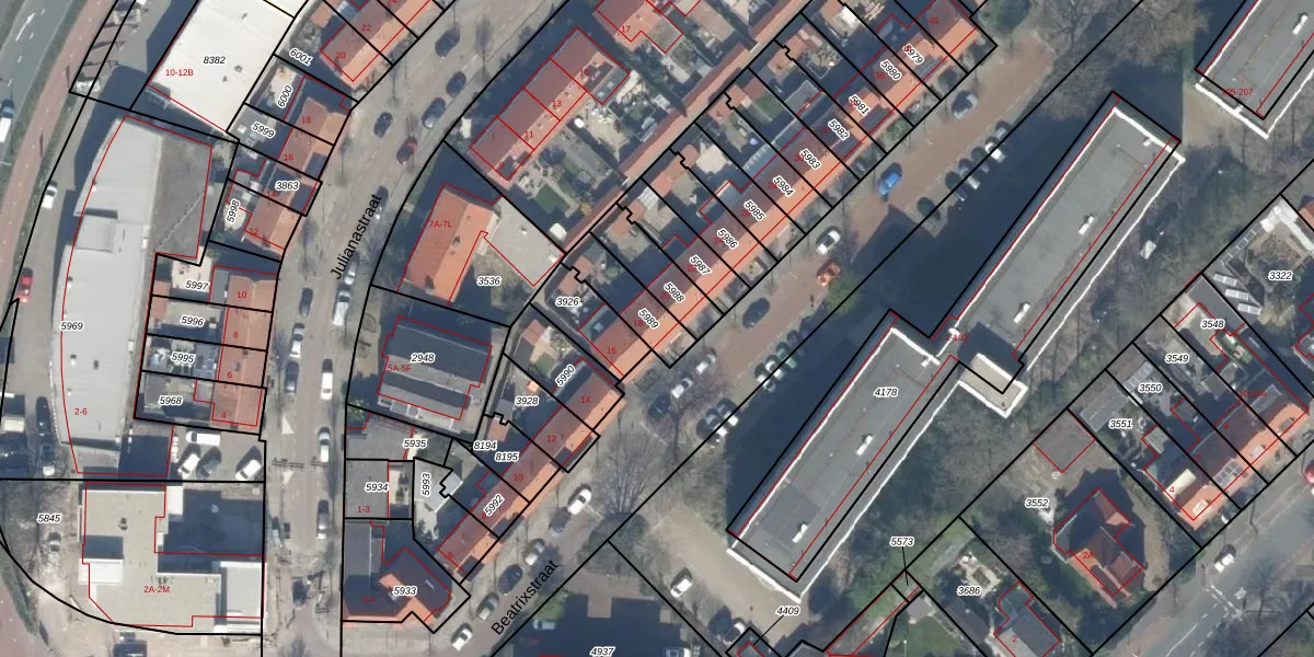 Gebruik de zoekbalk of klik op een perceel voor informatie over de adressen binnen dit perceel.