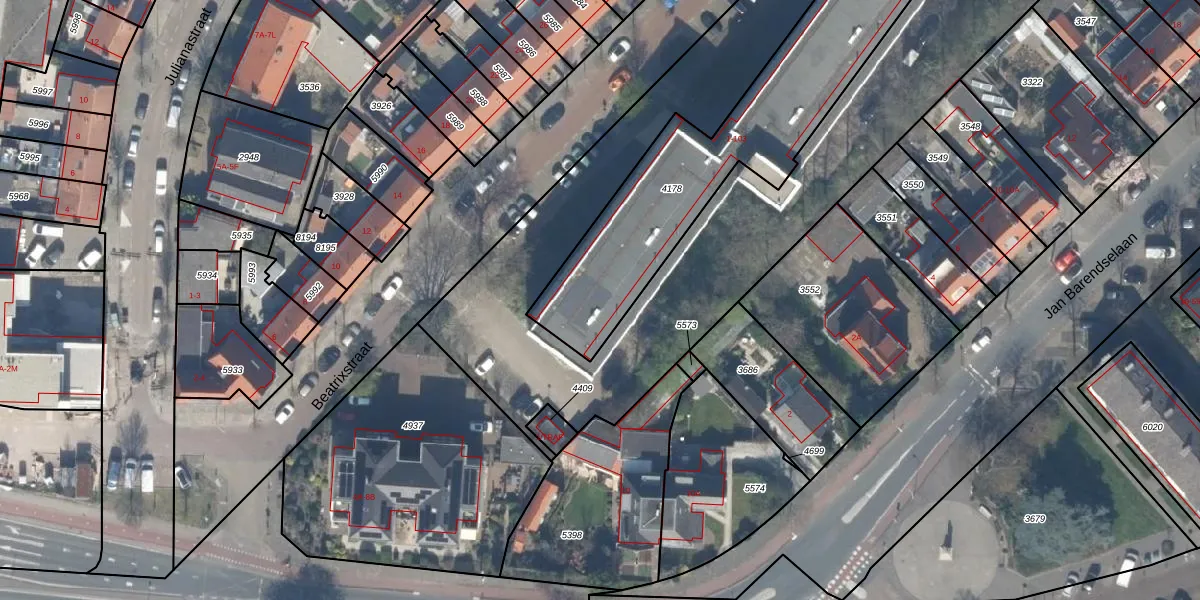 Het perceel waarop Beatrixstraat 3 staat heeft een oppervlakte van 1187 m². Dit is een zeer groot perceel. De perceeloppervlakte wordt geregistreerd door het Kadaster. Gedetailleerde informatie over de maten van dit perceel kunt u vinden in het rapport Kadastrale kaart met maatvoering van Beatrixstraat 3.