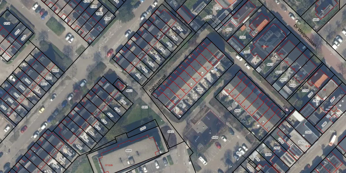 Het perceel waarop Dahliastraat 31 staat heeft een oppervlakte van 996 m². Dit is een groot perceel. De perceeloppervlakte wordt geregistreerd door het Kadaster. Gedetailleerde informatie over de maten van dit perceel kunt u vinden in het rapport Kadastrale kaart met maatvoering van Dahliastraat 31.
