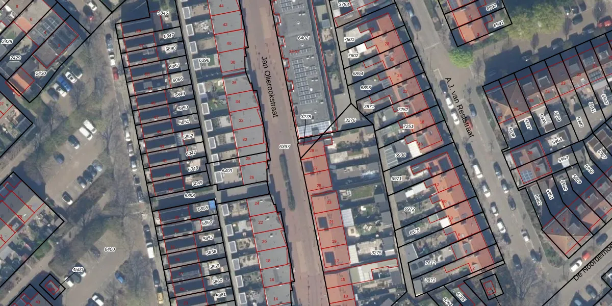 Het perceel waarop Jan Olierookstraat 29 staat heeft een oppervlakte van 22 m². Dit is een klein perceel. De perceeloppervlakte wordt geregistreerd door het Kadaster. Gedetailleerde informatie over de maten van dit perceel kunt u vinden in het rapport Kadastrale kaart met maatvoering van Jan Olierookstraat 29.