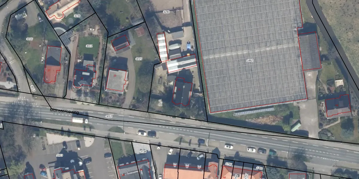 Het perceel waarop Monsterseweg 21 staat heeft een oppervlakte van 3192 m². Dit is een zeer groot perceel. De perceeloppervlakte wordt geregistreerd door het Kadaster. Gedetailleerde informatie over de maten van dit perceel kunt u vinden in het rapport Kadastrale kaart met maatvoering van Monsterseweg 21.