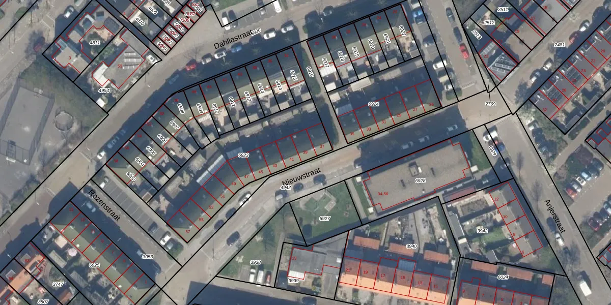 Het perceel waarop Nieuwstraat 39 staat heeft een oppervlakte van 1128 m². Dit is een zeer groot perceel. De perceeloppervlakte wordt geregistreerd door het Kadaster. Gedetailleerde informatie over de maten van dit perceel kunt u vinden in het rapport Kadastrale kaart met maatvoering van Nieuwstraat 39.