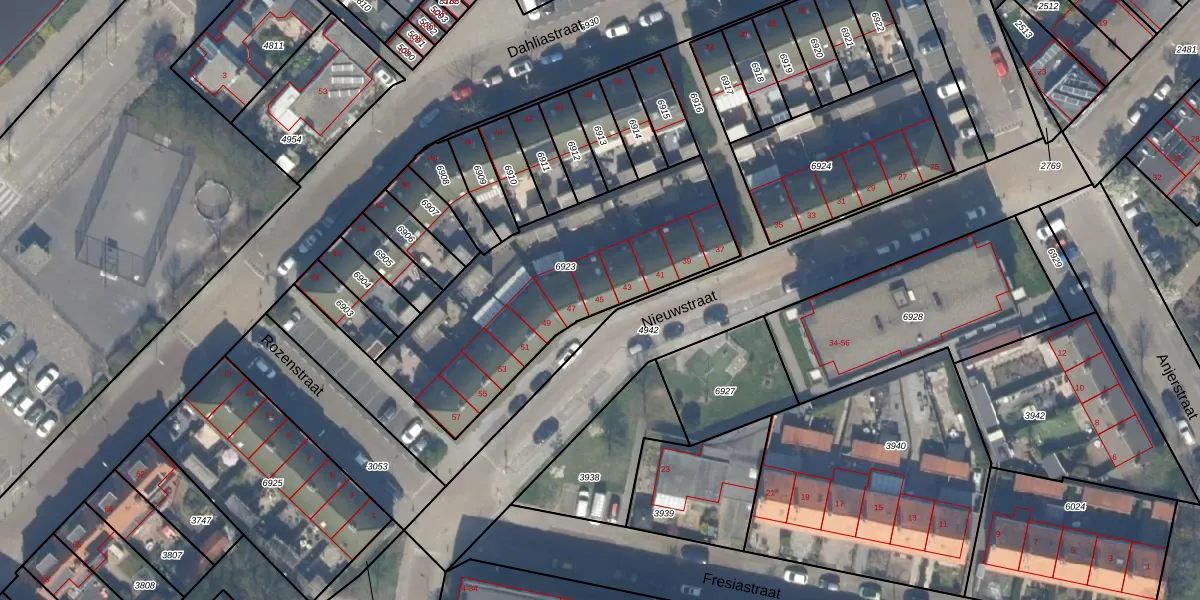 Het perceel waarop Nieuwstraat 45 staat heeft een oppervlakte van 1128 m². Dit is een zeer groot perceel. De perceeloppervlakte wordt geregistreerd door het Kadaster. Gedetailleerde informatie over de maten van dit perceel kunt u vinden in het rapport Kadastrale kaart met maatvoering van Nieuwstraat 45.