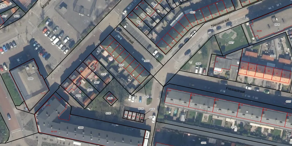 Het perceel waarop Rozenstraat 1 staat heeft een oppervlakte van 727 m². Dit is een groot perceel. De perceeloppervlakte wordt geregistreerd door het Kadaster. Gedetailleerde informatie over de maten van dit perceel kunt u vinden in het rapport Kadastrale kaart met maatvoering van Rozenstraat 1.