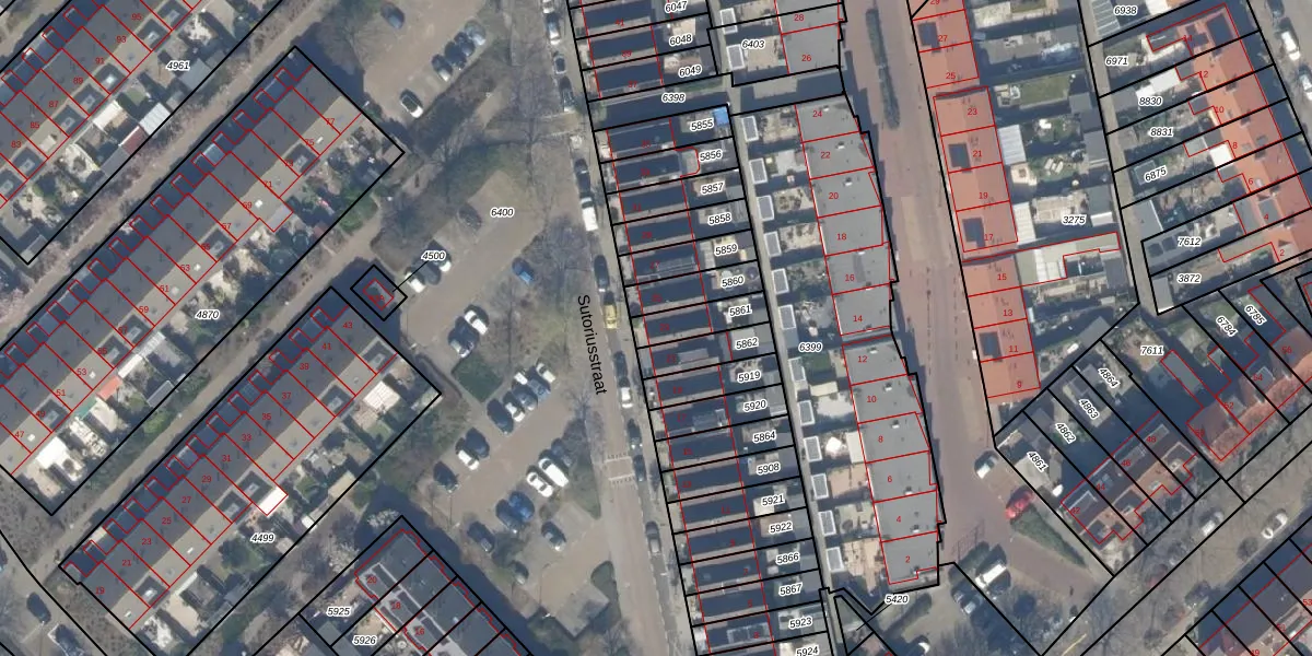 Het perceel waarop Sutoriusstraat 23 staat heeft een oppervlakte van 100 m². Dit is een middelgroot perceel. De perceeloppervlakte wordt geregistreerd door het Kadaster. Gedetailleerde informatie over de maten van dit perceel kunt u vinden in het rapport Kadastrale kaart met maatvoering van Sutoriusstraat 23.