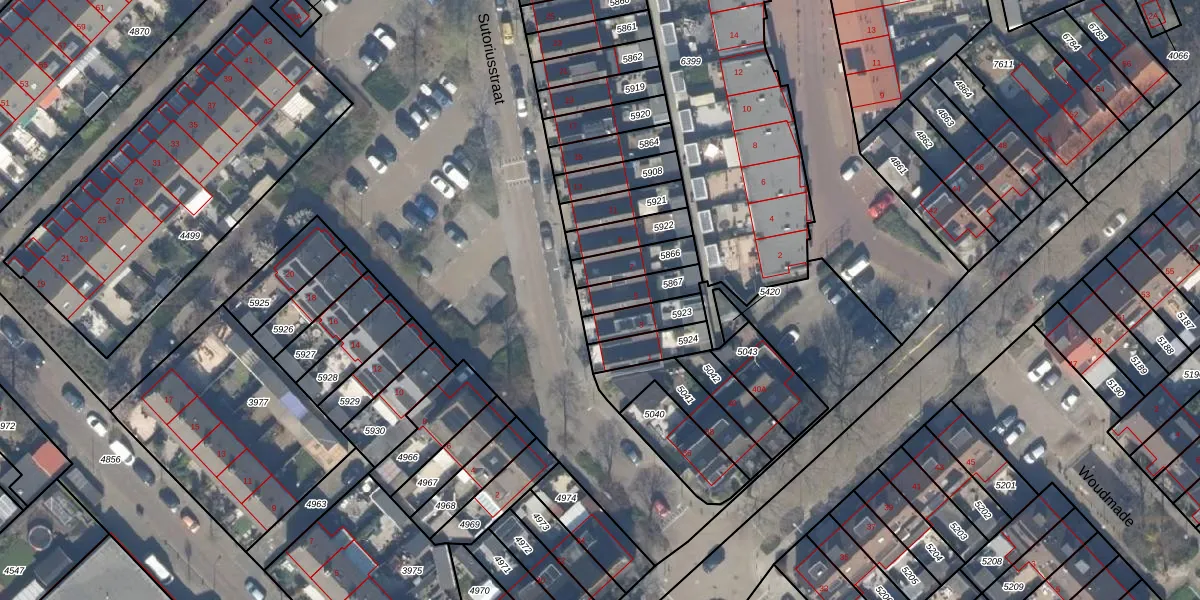 Sutoriusstraat 5 is gelegen op kadastraal perceel MSR00K5867. Deze kadastrale aanduiding is uniek en wordt gebruikt door het Kadaster om eigendomsrechten en andere zakelijke rechten vast te leggen. Het perceel maakt onderdeel uit van de kadastrale gemeente Monster.