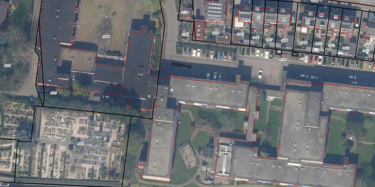 Het perceel waarop Wittebrug 33 staat heeft een oppervlakte van 1,2 ha. Dit is een zeer groot perceel. De perceeloppervlakte wordt geregistreerd door het Kadaster. Gedetailleerde informatie over de maten van dit perceel kunt u vinden in het rapport Kadastrale kaart met maatvoering van Wittebrug 33.