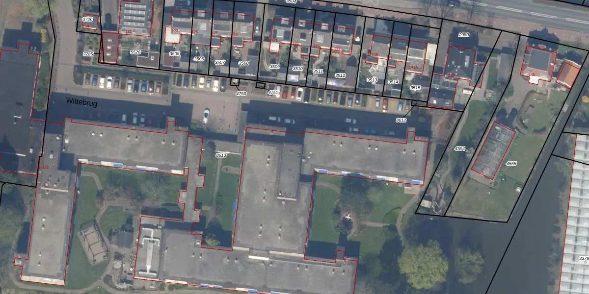 Het perceel waarop Wittebrug 55 staat heeft een oppervlakte van 1,2 ha. Dit is een zeer groot perceel. De perceeloppervlakte wordt geregistreerd door het Kadaster. Gedetailleerde informatie over de maten van dit perceel kunt u vinden in het rapport Kadastrale kaart met maatvoering van Wittebrug 55.