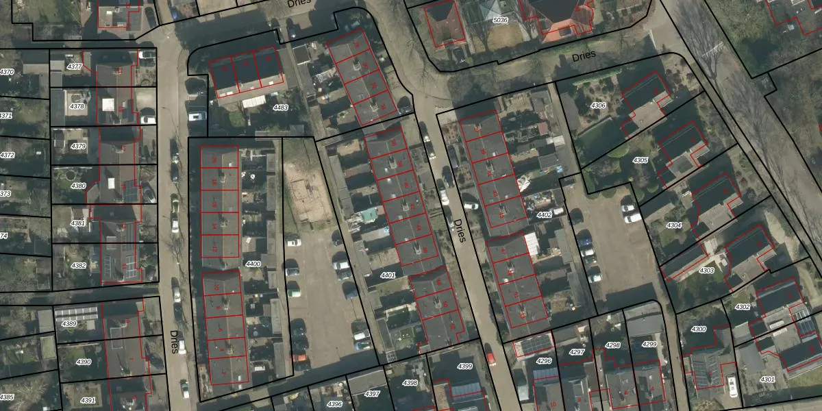 Het perceel waarop Dries 42 staat heeft een oppervlakte van 1445 m². Dit is een zeer groot perceel. De perceeloppervlakte wordt geregistreerd door het Kadaster. Gedetailleerde informatie over de maten van dit perceel kunt u vinden in het rapport Kadastrale kaart met maatvoering van Dries 42.