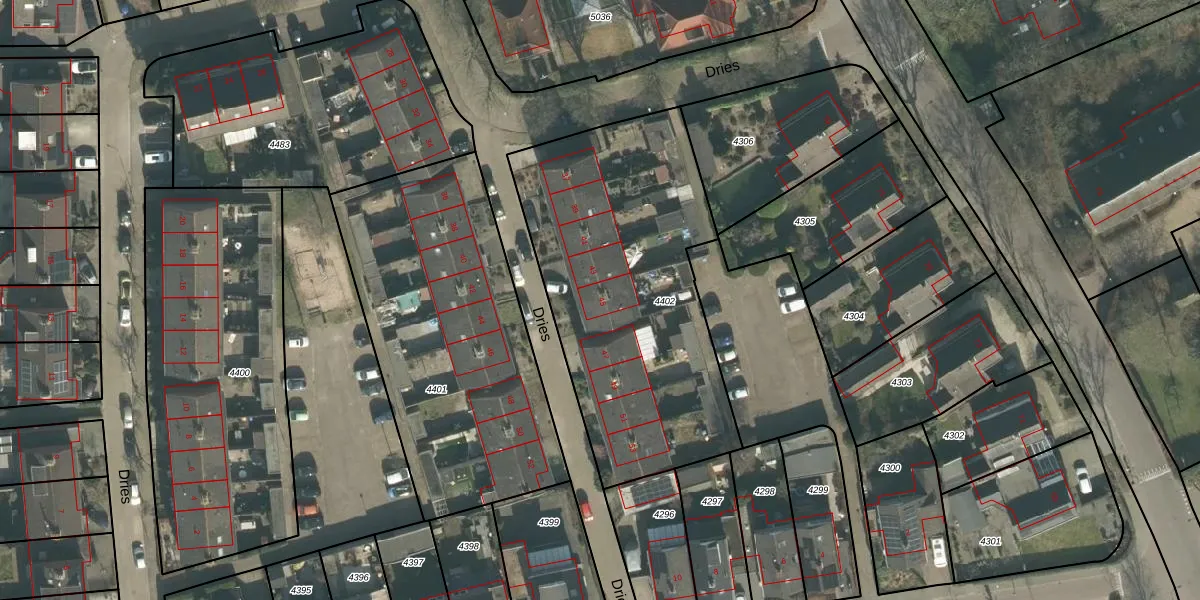 Het perceel waarop Dries 45 staat heeft een oppervlakte van 1535 m². Dit is een zeer groot perceel. De perceeloppervlakte wordt geregistreerd door het Kadaster. Gedetailleerde informatie over de maten van dit perceel kunt u vinden in het rapport Kadastrale kaart met maatvoering van Dries 45.
