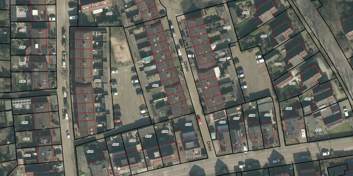 Het perceel waarop Dries 48 staat heeft een oppervlakte van 1445 m². Dit is een zeer groot perceel. De perceeloppervlakte wordt geregistreerd door het Kadaster. Gedetailleerde informatie over de maten van dit perceel kunt u vinden in het rapport Kadastrale kaart met maatvoering van Dries 48.