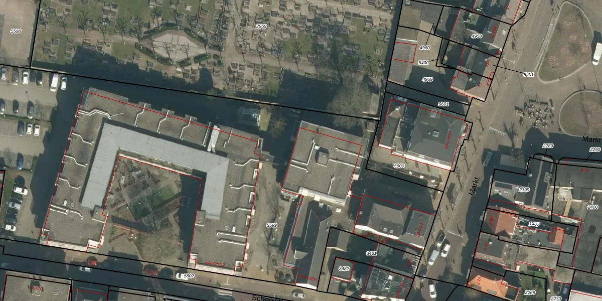 Het perceel waarop Markt 5-C3 staat heeft een oppervlakte van 7714 m². Dit is een zeer groot perceel. De perceeloppervlakte wordt geregistreerd door het Kadaster. Gedetailleerde informatie over de maten van dit perceel kunt u vinden in het rapport Kadastrale kaart met maatvoering van Markt 5-C3.