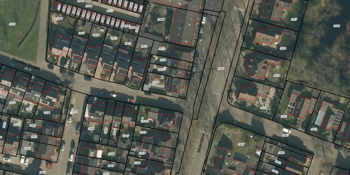 Het perceel waarop Moleneind 44 staat heeft een oppervlakte van 281 m². Dit is een middelgroot perceel. De perceeloppervlakte wordt geregistreerd door het Kadaster. Gedetailleerde informatie over de maten van dit perceel kunt u vinden in het rapport Kadastrale kaart met maatvoering van Moleneind 44.