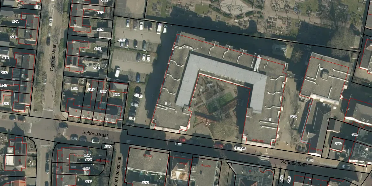 Het perceel waarop Schoolstraat 2-A3 staat heeft een oppervlakte van 7714 m². Dit is een zeer groot perceel. De perceeloppervlakte wordt geregistreerd door het Kadaster. Gedetailleerde informatie over de maten van dit perceel kunt u vinden in het rapport Kadastrale kaart met maatvoering van Schoolstraat 2-A3.