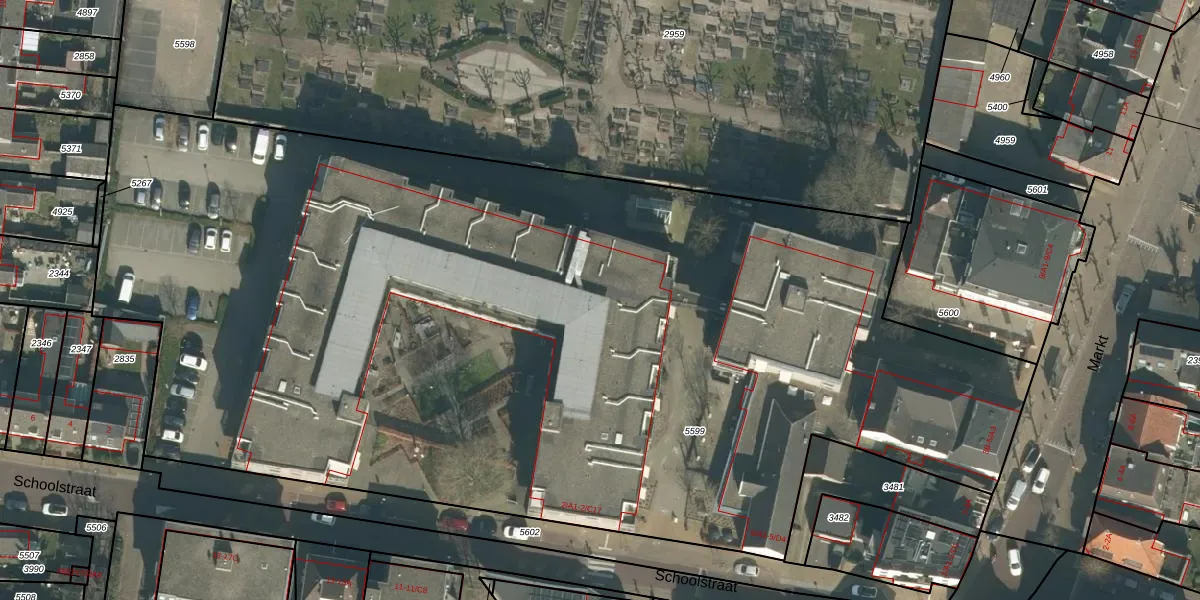 Het perceel waarop Schoolstraat 2-B12 staat heeft een oppervlakte van 7714 m². Dit is een zeer groot perceel. De perceeloppervlakte wordt geregistreerd door het Kadaster. Gedetailleerde informatie over de maten van dit perceel kunt u vinden in het rapport Kadastrale kaart met maatvoering van Schoolstraat 2-B12.