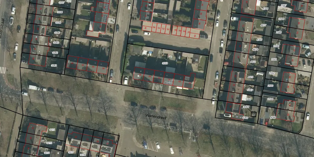Het perceel waarop Vianendreef 22 staat heeft een oppervlakte van 1405 m². Dit is een zeer groot perceel. De perceeloppervlakte wordt geregistreerd door het Kadaster. Gedetailleerde informatie over de maten van dit perceel kunt u vinden in het rapport Kadastrale kaart met maatvoering van Vianendreef 22.