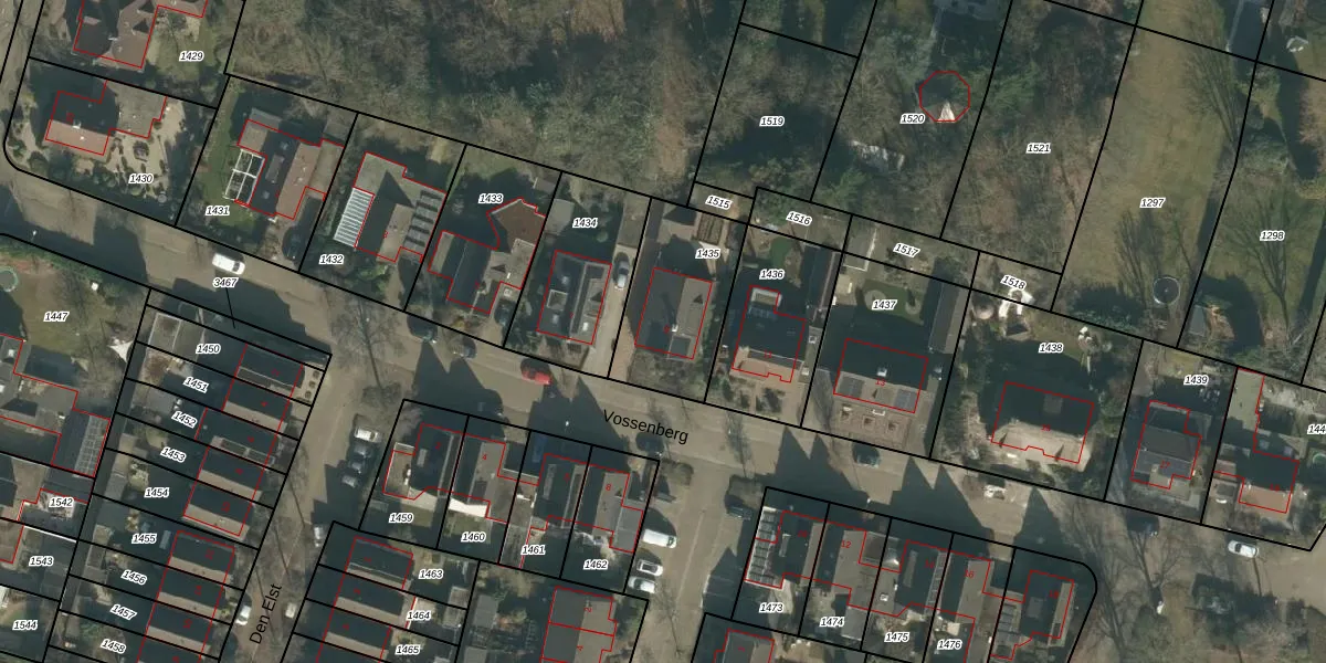 Het perceel waarop Vossenberg 9 staat heeft een oppervlakte van 421 m². Dit is een groot perceel. De perceeloppervlakte wordt geregistreerd door het Kadaster. Gedetailleerde informatie over de maten van dit perceel kunt u vinden in het rapport Kadastrale kaart met maatvoering van Vossenberg 9.