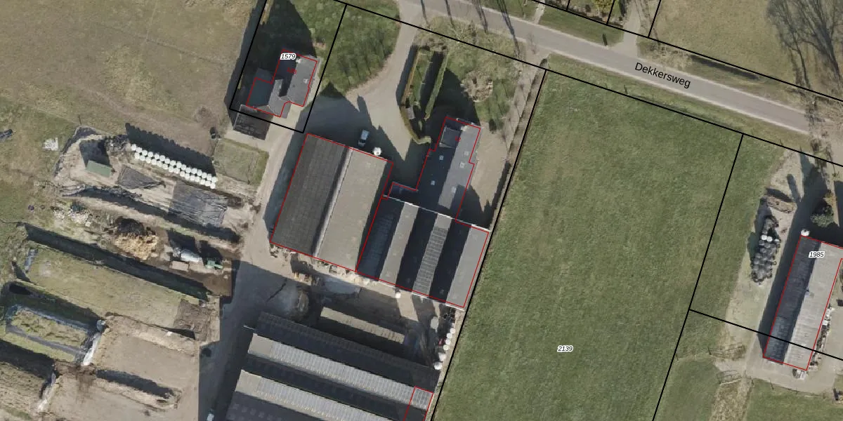 Het perceel waarop Dekkersweg 12 staat heeft een oppervlakte van 6,5 ha. Dit is een zeer groot perceel. De perceeloppervlakte wordt geregistreerd door het Kadaster. Gedetailleerde informatie over de maten van dit perceel kunt u vinden in het rapport Kadastrale kaart met maatvoering van Dekkersweg 12.
