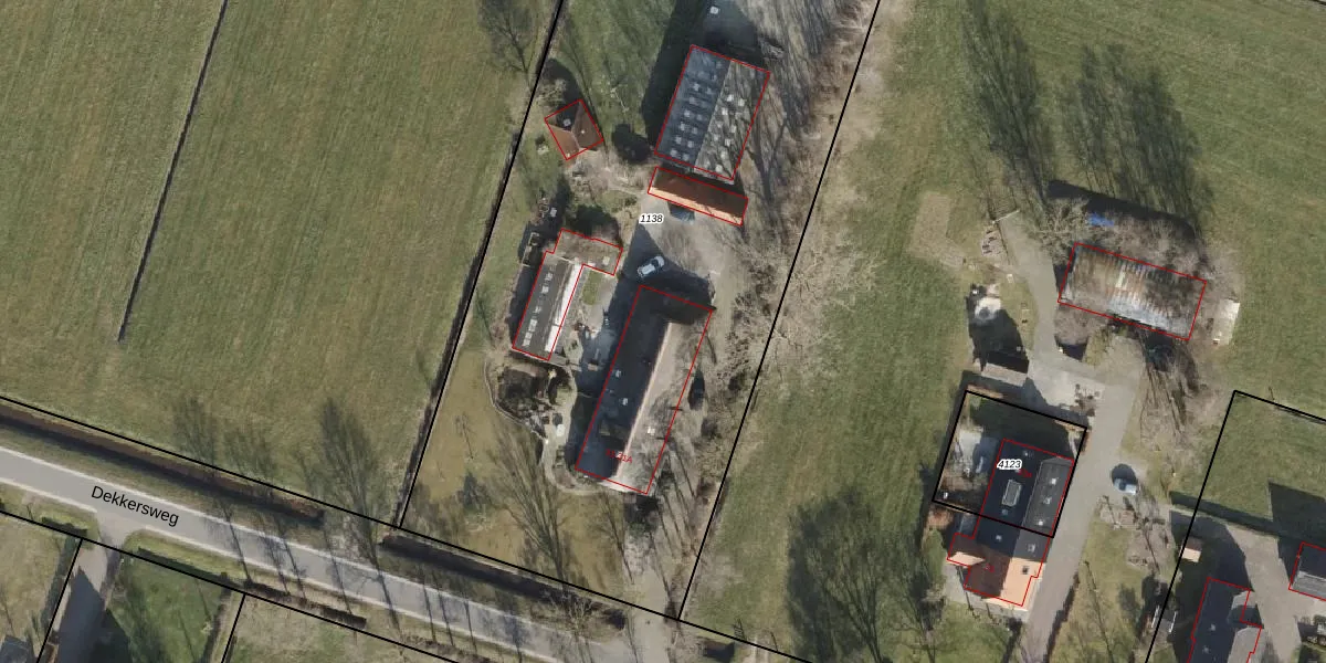 Het perceel waarop Dekkersweg 31-a staat heeft een oppervlakte van 4965 m². Dit is een zeer groot perceel. De perceeloppervlakte wordt geregistreerd door het Kadaster. Gedetailleerde informatie over de maten van dit perceel kunt u vinden in het rapport Kadastrale kaart met maatvoering van Dekkersweg 31-a.