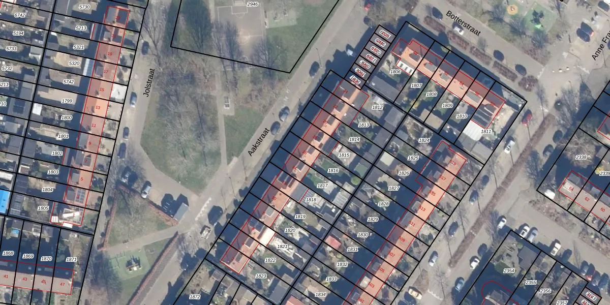 Gebruik de zoekbalk of klik op een perceel voor informatie over de adressen binnen dit perceel.