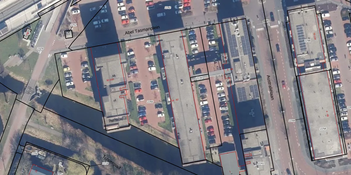Het perceel waarop Abel Tasmanplein 64 staat heeft een oppervlakte van 4500 m². Dit is een zeer groot perceel. De perceeloppervlakte wordt geregistreerd door het Kadaster. Gedetailleerde informatie over de maten van dit perceel kunt u vinden in het rapport Kadastrale kaart met maatvoering van Abel Tasmanplein 64.
