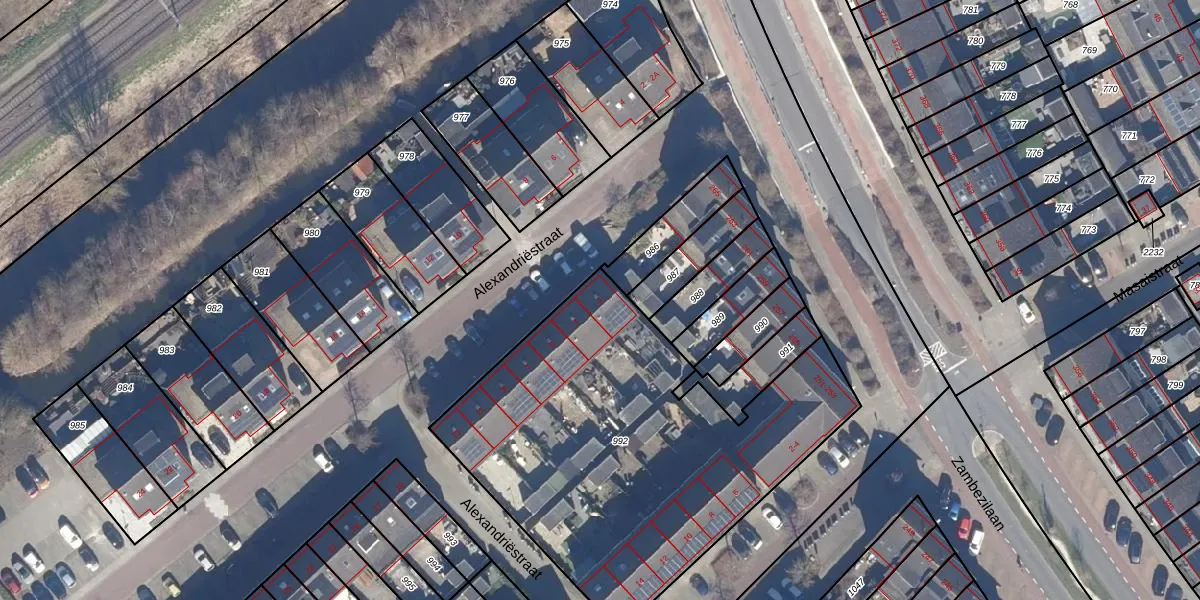 Het perceel waarop Alexandriëstraat 1 staat heeft een oppervlakte van 2033 m². Dit is een zeer groot perceel. De perceeloppervlakte wordt geregistreerd door het Kadaster. Gedetailleerde informatie over de maten van dit perceel kunt u vinden in het rapport Kadastrale kaart met maatvoering van Alexandriëstraat 1.