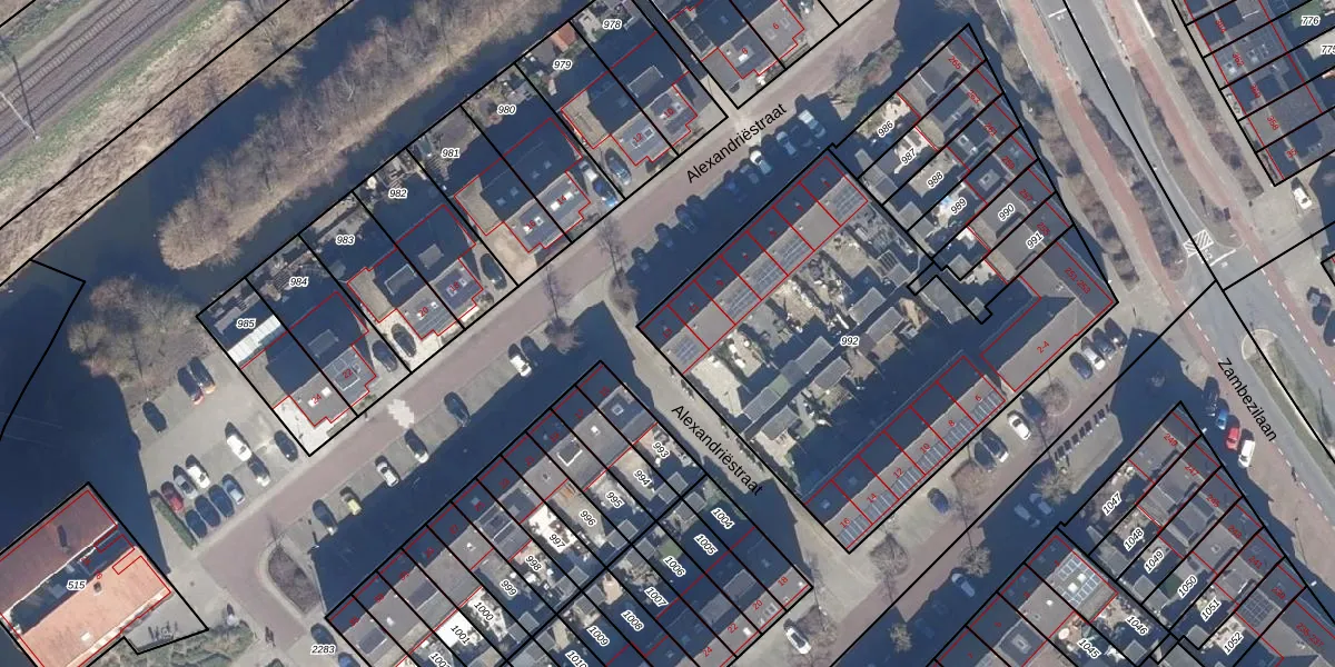 Het perceel waarop Alexandriëstraat 13 staat heeft een oppervlakte van 2033 m². Dit is een zeer groot perceel. De perceeloppervlakte wordt geregistreerd door het Kadaster. Gedetailleerde informatie over de maten van dit perceel kunt u vinden in het rapport Kadastrale kaart met maatvoering van Alexandriëstraat 13.