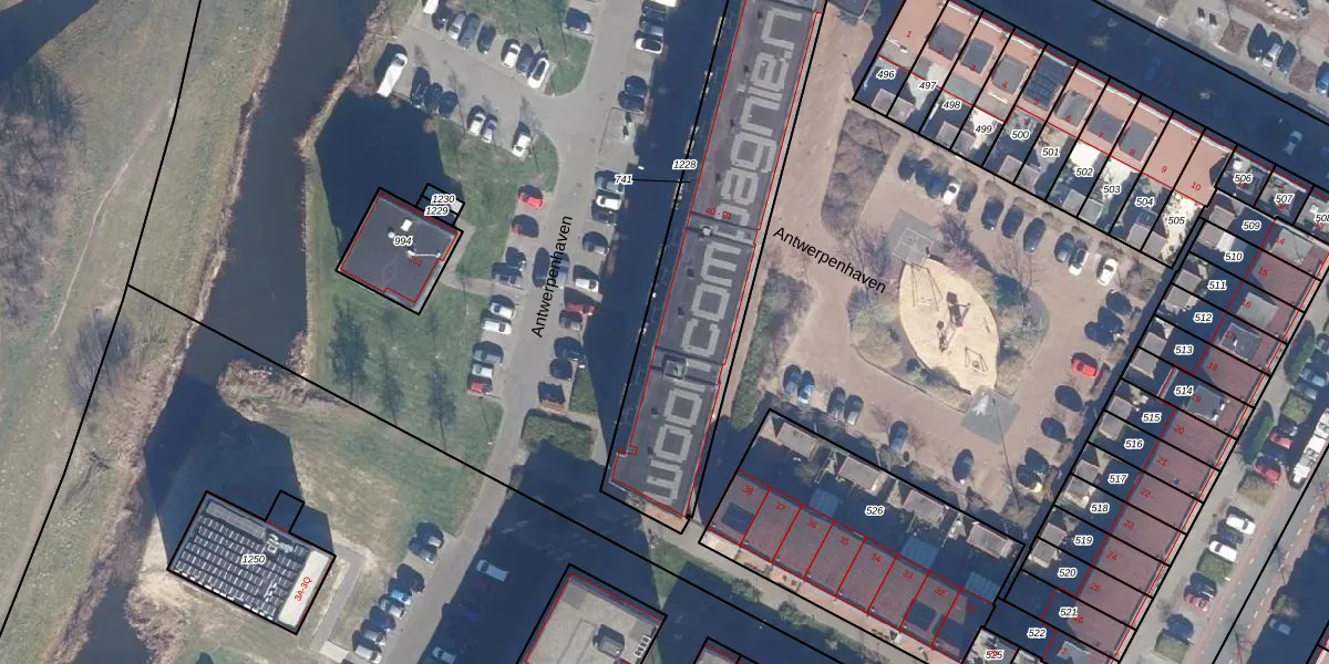 Het perceel waarop Antwerpenhaven 54 staat heeft een oppervlakte van 1345 m². Dit is een zeer groot perceel. De perceeloppervlakte wordt geregistreerd door het Kadaster. Gedetailleerde informatie over de maten van dit perceel kunt u vinden in het rapport Kadastrale kaart met maatvoering van Antwerpenhaven 54.