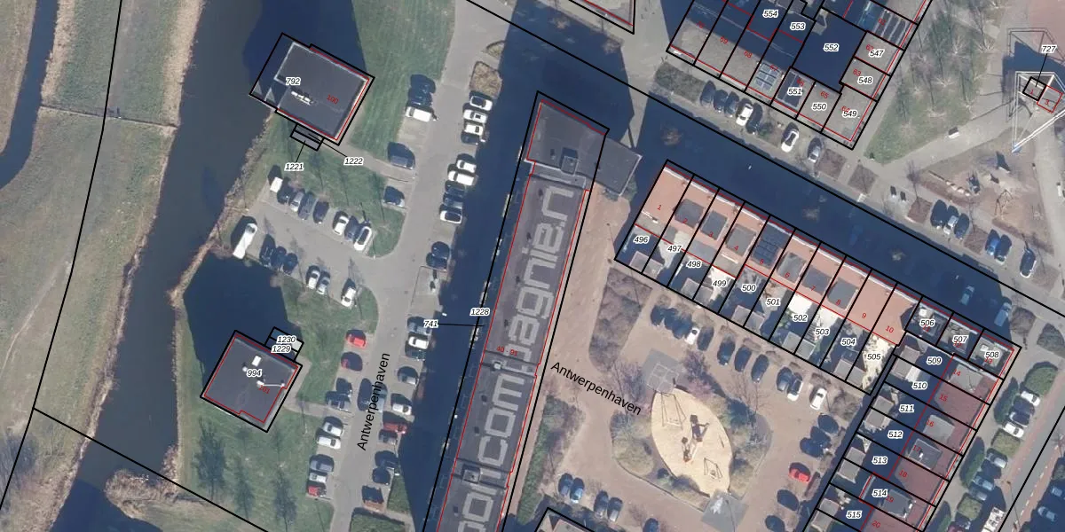 Het perceel waarop Antwerpenhaven 66 staat heeft een oppervlakte van 1345 m². Dit is een zeer groot perceel. De perceeloppervlakte wordt geregistreerd door het Kadaster. Gedetailleerde informatie over de maten van dit perceel kunt u vinden in het rapport Kadastrale kaart met maatvoering van Antwerpenhaven 66.