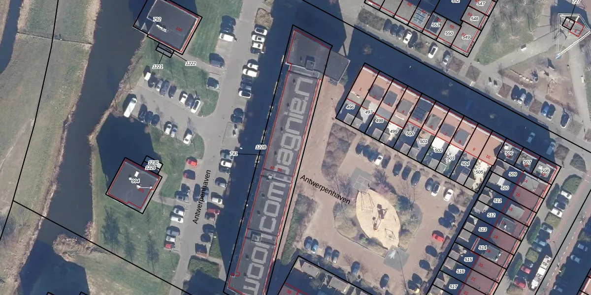 Het perceel waarop Antwerpenhaven 89 staat heeft een oppervlakte van 1345 m². Dit is een zeer groot perceel. De perceeloppervlakte wordt geregistreerd door het Kadaster. Gedetailleerde informatie over de maten van dit perceel kunt u vinden in het rapport Kadastrale kaart met maatvoering van Antwerpenhaven 89.