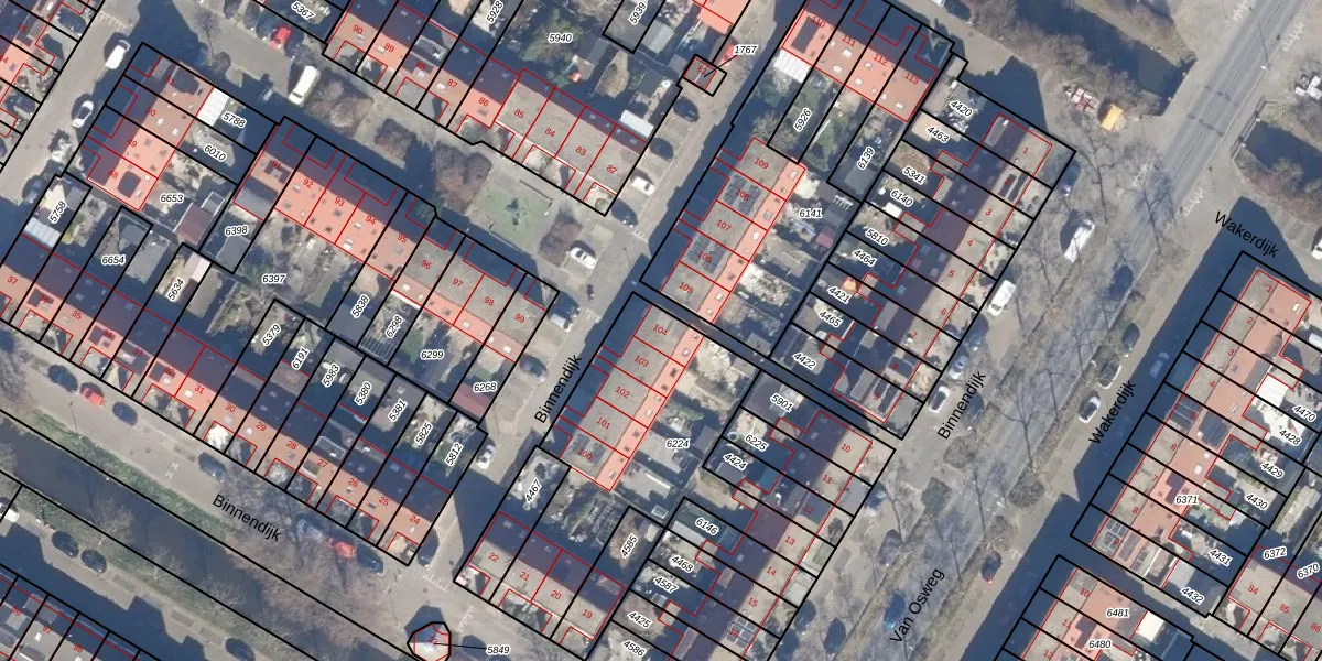 Het perceel waarop Binnendijk 104 staat heeft een oppervlakte van 1017 m². Dit is een zeer groot perceel. De perceeloppervlakte wordt geregistreerd door het Kadaster. Gedetailleerde informatie over de maten van dit perceel kunt u vinden in het rapport Kadastrale kaart met maatvoering van Binnendijk 104.