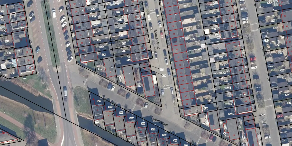 Het perceel waarop Bonsaistraat 42 staat heeft een oppervlakte van 323 m². Dit is een groot perceel. De perceeloppervlakte wordt geregistreerd door het Kadaster. Gedetailleerde informatie over de maten van dit perceel kunt u vinden in het rapport Kadastrale kaart met maatvoering van Bonsaistraat 42.