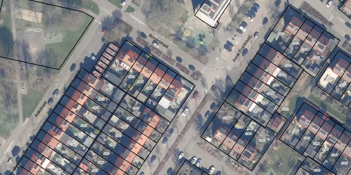 Het perceel waarop Botterstraat 58 staat heeft een oppervlakte van 303 m². Dit is een groot perceel. De perceeloppervlakte wordt geregistreerd door het Kadaster. Gedetailleerde informatie over de maten van dit perceel kunt u vinden in het rapport Kadastrale kaart met maatvoering van Botterstraat 58.