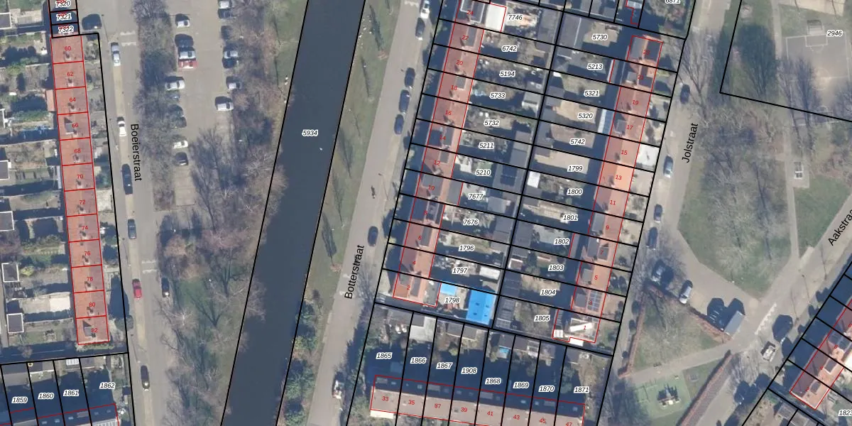 Het perceel waarop Botterstraat 8 staat heeft een oppervlakte van 169 m². Dit is een middelgroot perceel. De perceeloppervlakte wordt geregistreerd door het Kadaster. Gedetailleerde informatie over de maten van dit perceel kunt u vinden in het rapport Kadastrale kaart met maatvoering van Botterstraat 8.